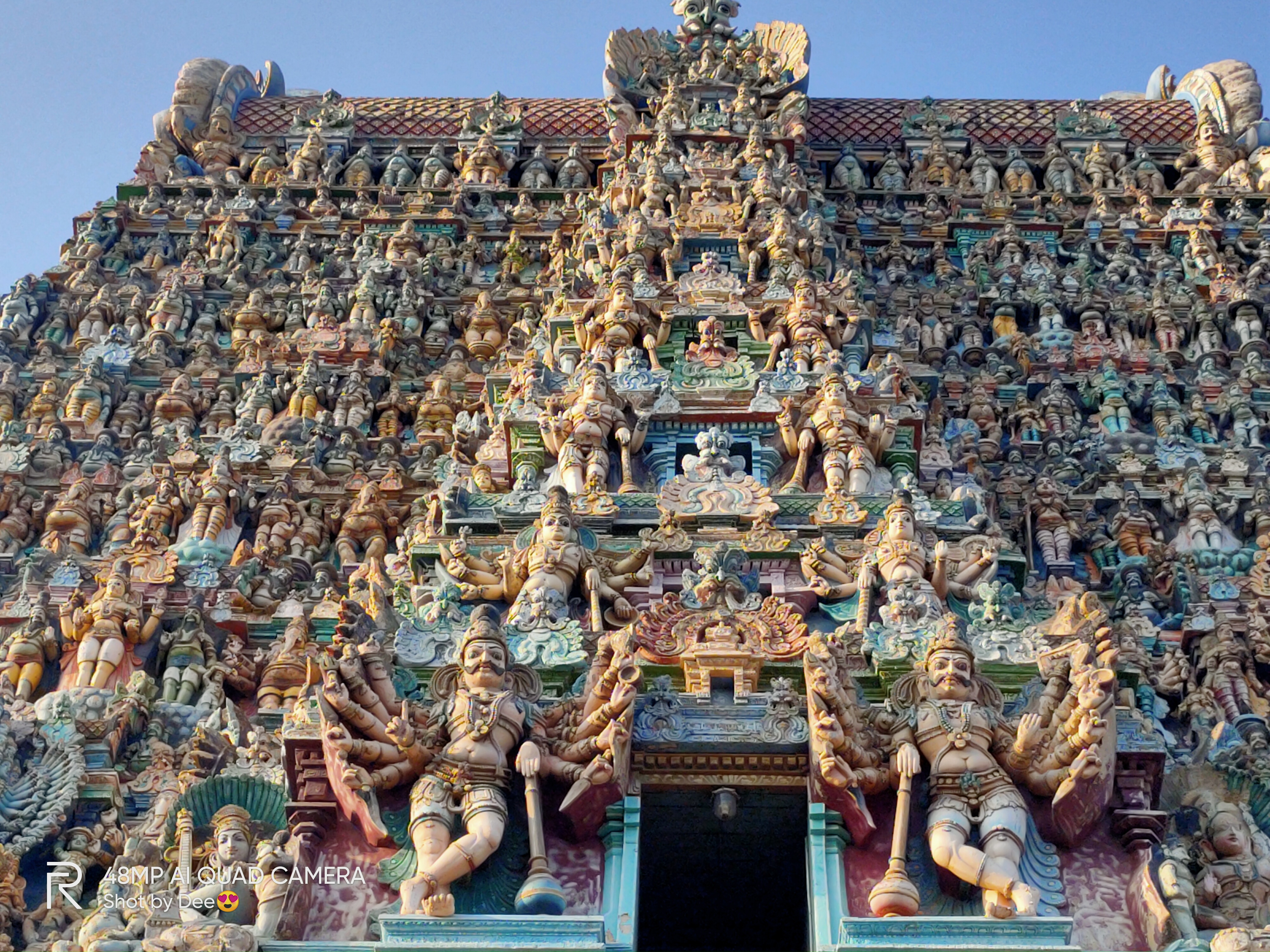 The magnificent gopurams (temple towers) are the main attraction at Madurai Meenakshi Temple and evenings are the best time to visit. We were asked to deposit our mobiles, cameras, bags along with shoes and socks. The temple is massive and the architecture is amazing. Every inch of the gopurams are filled with figurines of gods, goddesses, mythological creatures and looks colourful, stunning and symmetrical.